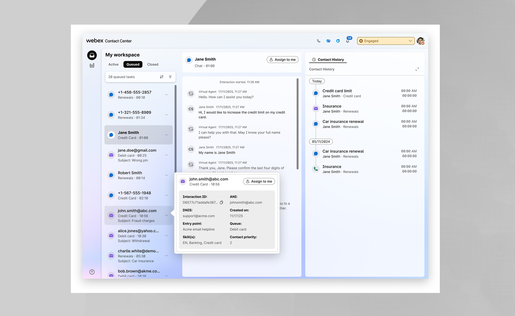 The Webex Contact Heart Agent Desktop places brokers and prospects on the coronary heart of each interplay. It’s a trendy workspace, reimagined to make your day smoother, quicker, and an entire lot extra rewarding.