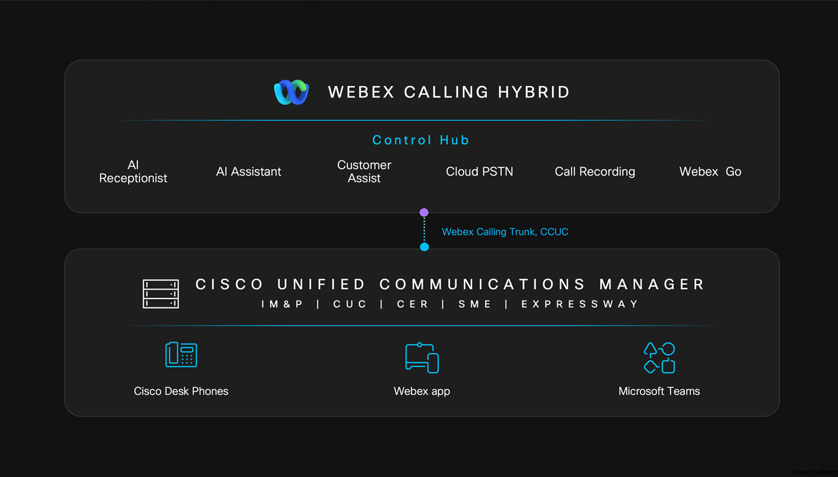 Connectivity with cloud providers is one other space the place hybrid delivers speedy worth. Webex Calling Hybrid extends cloud-connected communication and safety providers immediately into current Cisco Unified Communications Supervisor (UCM) environments, decreasing reliance on on-premises infrastructure whereas growing flexibility and management.